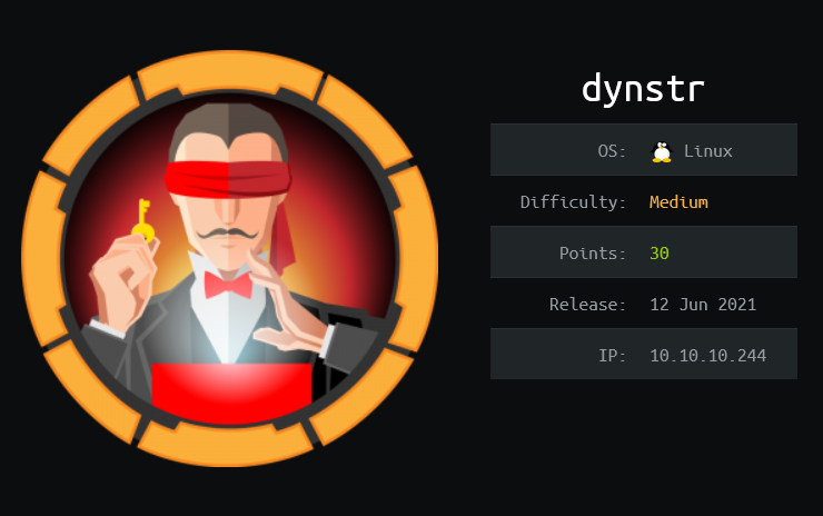 Dynstr imitates a company that offers a Dynamic DNS service. The provided API for this service is vulnerable to command injection, allowing me to gain initial access to the system. Enumerating inside the system reveals log files that leak the user SSH key that can only be used after manipulating the DNS records. For the root part, there is a custom script that is vulnerable to wildcard injection. Since the script can be run as root with sudo, it is possible to gain root access from it.