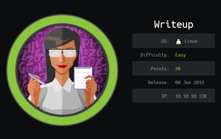 Writeup is another box I completed during the HackTheBox easy month. It starts off by exploiting a CMS that is vulnerable to SQL injection to retrieve credentials from the database, and these credentials allow me to SSH login into the machine. Internal enumeration of the machine discovers a binary that gets executed by root user if someone logs in via SSH. This binary is called without its absolute path. With a write access on a PATH directory, I could hijack the binary to gain myself a root shell.